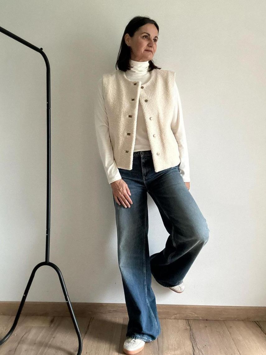 Pero también ha demostrado ser un acierto con buenos básicos, más formales, como vaqueros azules de corte recto, una camisa blanca y un chaleco de efecto borreguito.