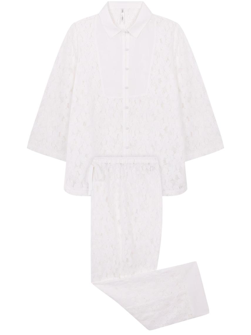 No te pierdas este pijama camisero de manga larga y pantalón confeccionado con tejido de bordado suizo en color blanco. Incluye una camisa con manga caída, pechera y botones forrados, un pantalón lounge con cinturilla elástica ajustable. Combina con otras prendas y accesorios de la colección (34,99 €).