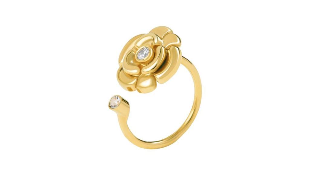 La línea incluye diseños inspirados en el poder de las flores, concretamente, en el de la rosa. Uno de ellos es el anillo abierto Spring Rose de oro amarillo de 18 quilates, con diamantes talla brillante. Un modelo muy especial que podrás lucir con otros anillos o por separado.