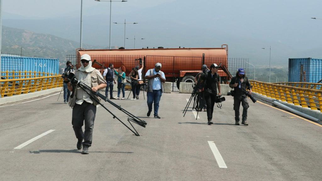 Las tres pistas del puente binacional de Tienditas, por donde se espera que pase la ayuda humanitaria, permanecen bloqueadas por el régimen de Nicolás Maduro, que puso en la mitad la cisterna naranja de un camión y dos contenedores azules, así como unas mallas metálicas que impiden el paso hacia el lado venezolano de la frontera.