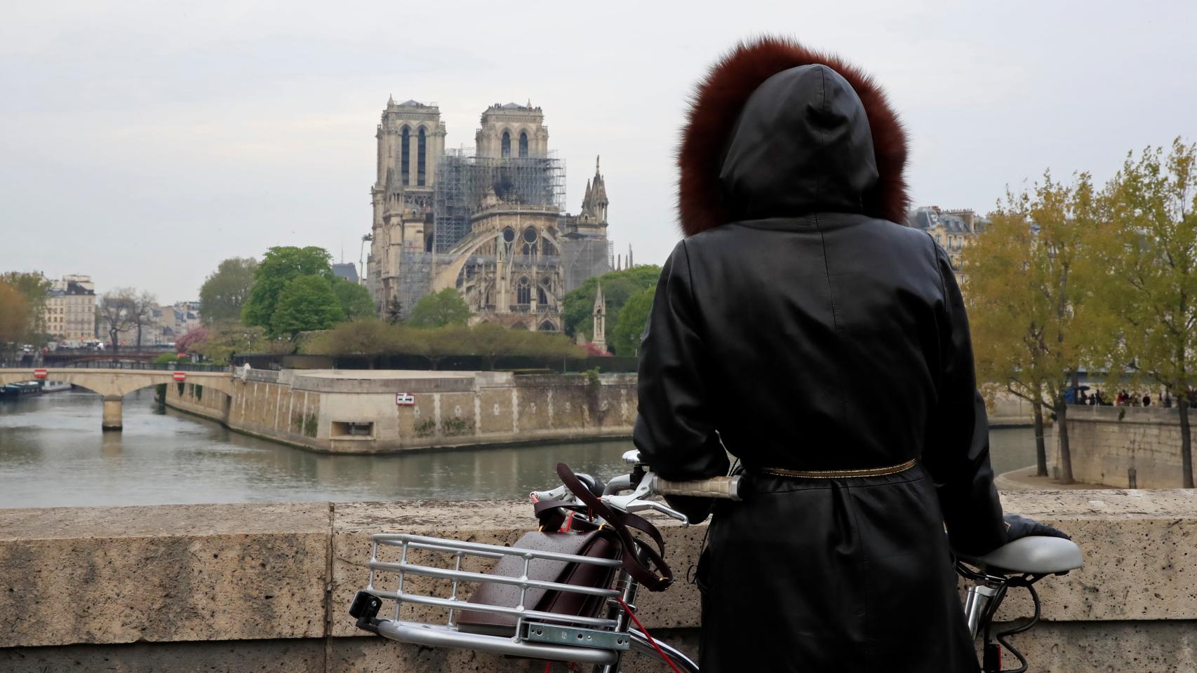 Una mujer mira Notre-Dame desde el otro lado del Sena.