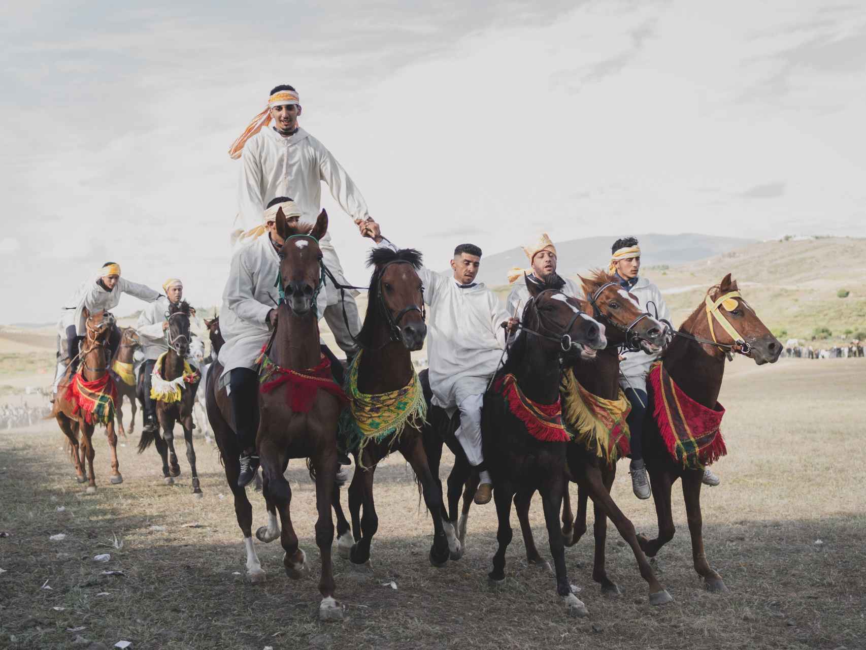 Nos encontramos en los montes de Beni Arous, a unos 40 kilómetros de la ciudad de Tánger. Una vez al año, cuando finaliza la época de siega, los diferentes pueblos de la región se reúnen en este desabrigado valle para participar en el Mata Moussem, una carrera ecuestre de origen mongol con más de 800 años de antigüedad. Caída en el olvido durante siglos, en 2010 esta tradición ancestral fue resucitada por la familia Baraka -descendiente directa del poeta sufí Moulay Absselam- y convertida en un festival de tres días que cuenta con el patrocinio del rey Mohamed VI y el apoyo de la UNESCO.
