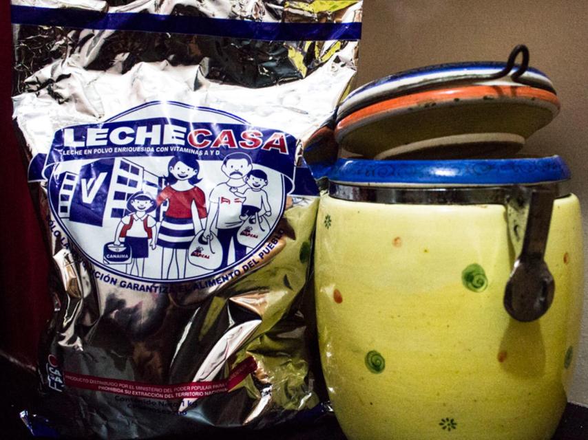 En otros productos, igual de escasos, la propaganda es más evidente. Hay bolsas de frijoles negros con el rostro de Hugo Chávez estampado y la leche de la estatal De Casa, por ejemplo, muestra en su empaque el sueño socialista: se ve a una familia feliz, con niños que van al colegio con su canaimita (ordenador portátil que entrega el Estado), los padres cargan bolsas llenas de productos de Mercal, la red estatal de mercados, se da a entender que viven en un edificio de la Misión Vivienda y hasta están vestidos con “los ojitos Chávez”.