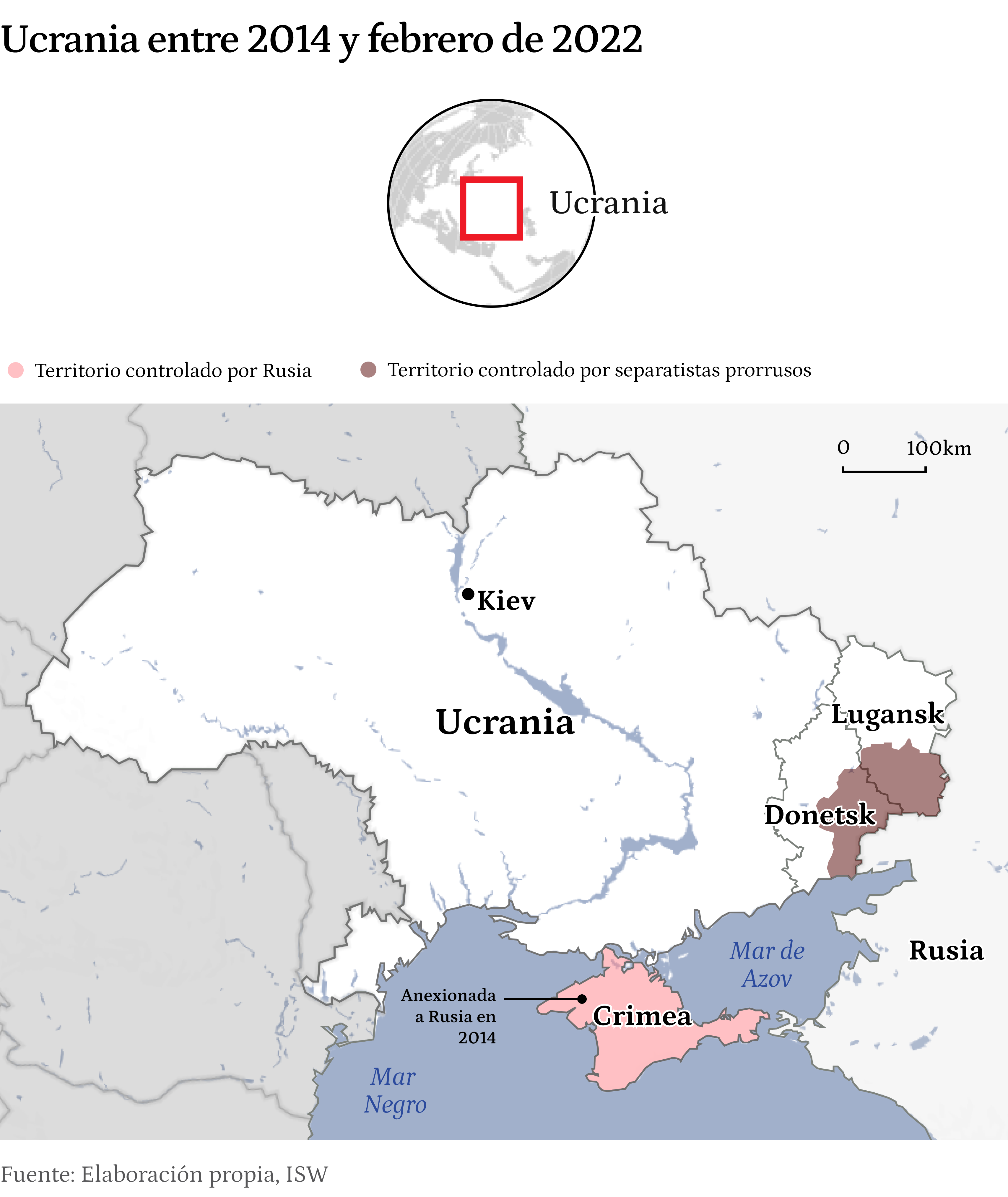El mapa de Ucrania ha mutado desde 2014. En marzo de ese año, las fuerzas especiales rusas, los famosos "hombrecillos verdes" desprovistos de identificación, invadieron la península de Crimea. Era la respuesta del Kremlin a la revolución de carácter proeuropeo del Maidán que, sólo un mes antes, había forzado la huida del país del expresidente Víktor Yanukóvich, un títere en manos de Putin.