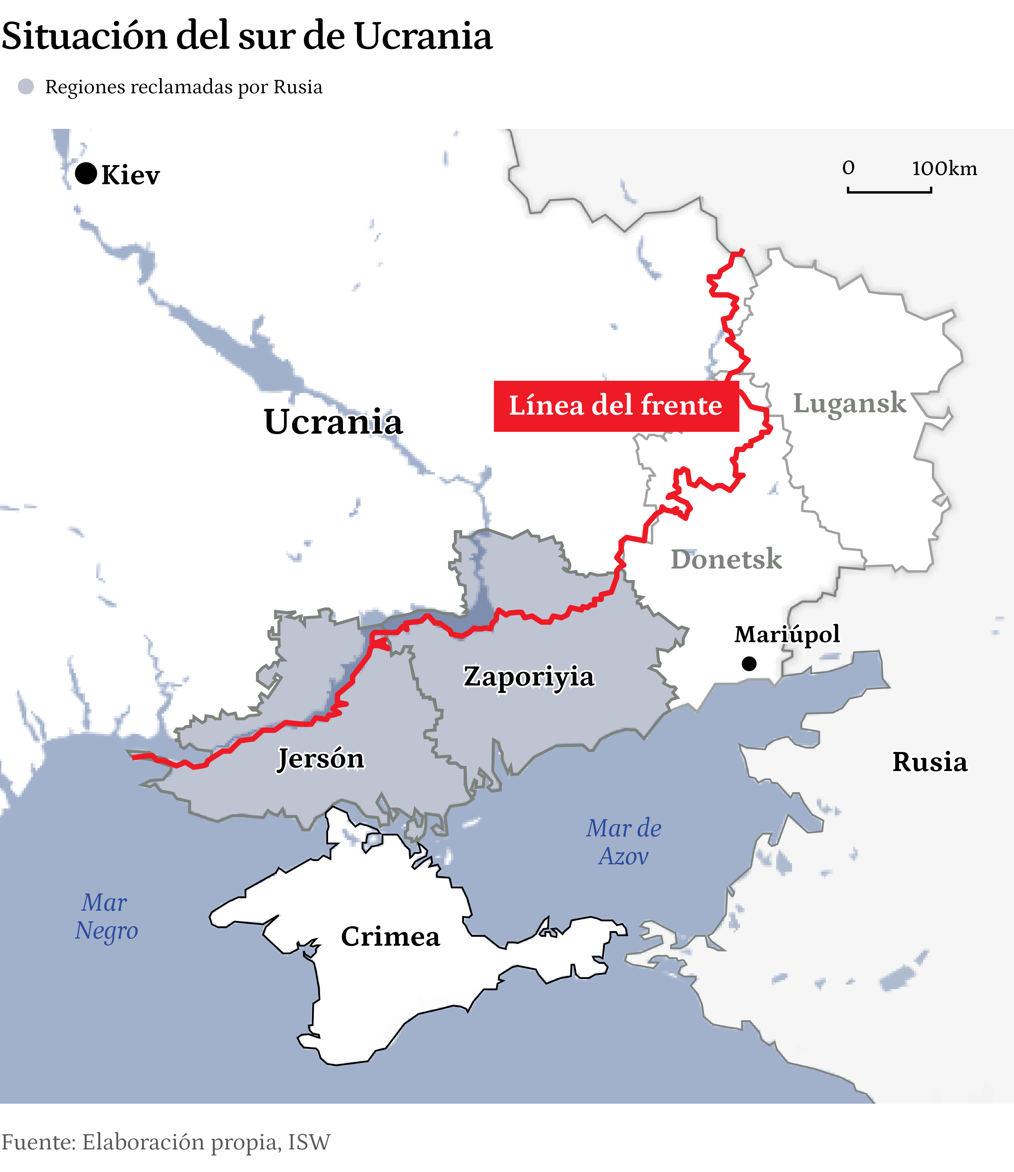 Las fuerzas rusas controlan alrededor del 74 por ciento de las regiones de Zaporiyia y Jersón. O lo que es lo mismo, unos 41.176 kilómetros cuadrados. Mientras tanto, el Ejército ucraniano mantiene sus posiciones en 14.500 kilómetros cuadrados de ambas regiones. Las tropas rusas controlan la mayor parte del territorio, pero no sus respectivas capitales.