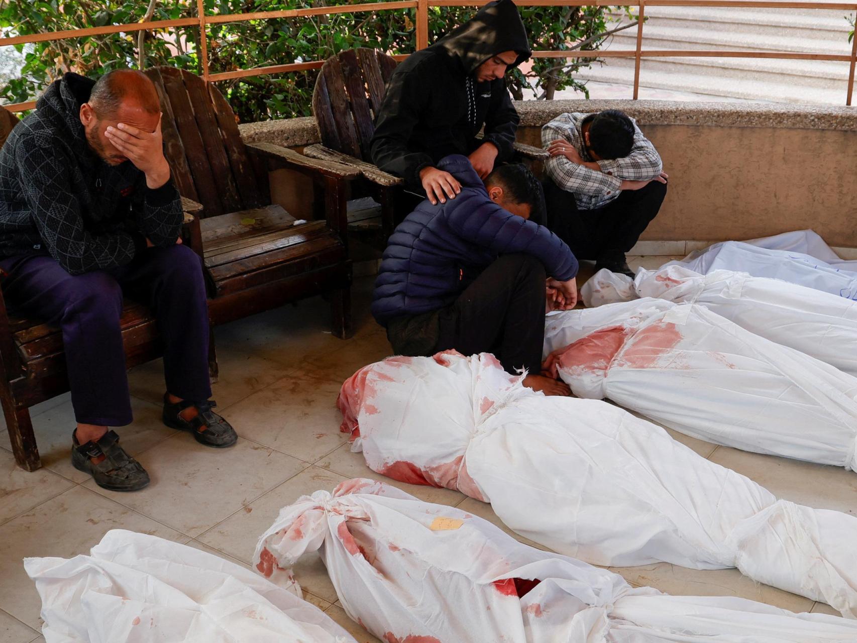 Un grupo de mujeres velan varios cadáveres en un hospital de Gaza.