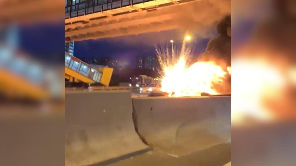 El momento más dramático ocurrió poco después, cuando dos explosiones se sucedieron en apenas unos segundos; el fuego envolvió todo el vehículo y sólo quedó el chasis de metal. Un vídeo de Instagram, grabado por un conductor que se dirigía en la otra dirección, muestra el momento de las explosiones.