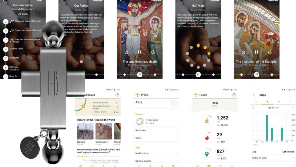 Pero la función principal de esta pulsera es rezar. Curiosamente, para activarla tenemos que hacer la señal de la cruz con el brazo en el que llevemos la pulsera; entonces activará la sincronización con nuestro móvil.