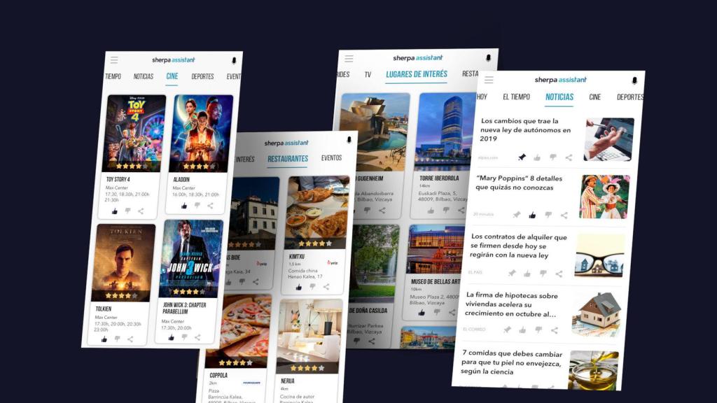 La nueva interfaz de Sherpa se basa en tarjetas que muestran datos relacionados con nuestra vida. Por ejemplo, entra en la pestaña de cine, y encontrarás datos de películas que te podrían interesar y cómo verlas. Si lo que buscas es un sitio en el que comer, la app mostrará restaurantes que se adapten a tus gustos y que deberías probar; relacionado, también tiene una sección de lugares de interés dependiendo de nuestra localización.