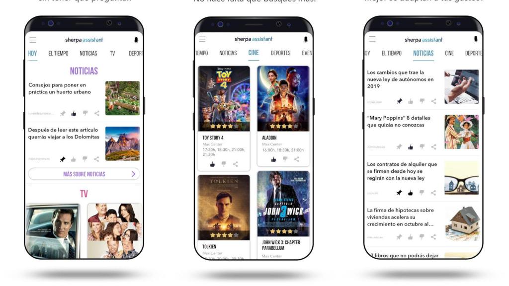 Para ello, Sherpa hace uso de lo que sus propios creadores afirman que es su punto fuerte: su componente predictivo. En otras palabras, Sherpa es capaz de predecir lo que necesitamos y cómo lo necesitamos, basándose en nuestros hábitos, gustos e intereses.