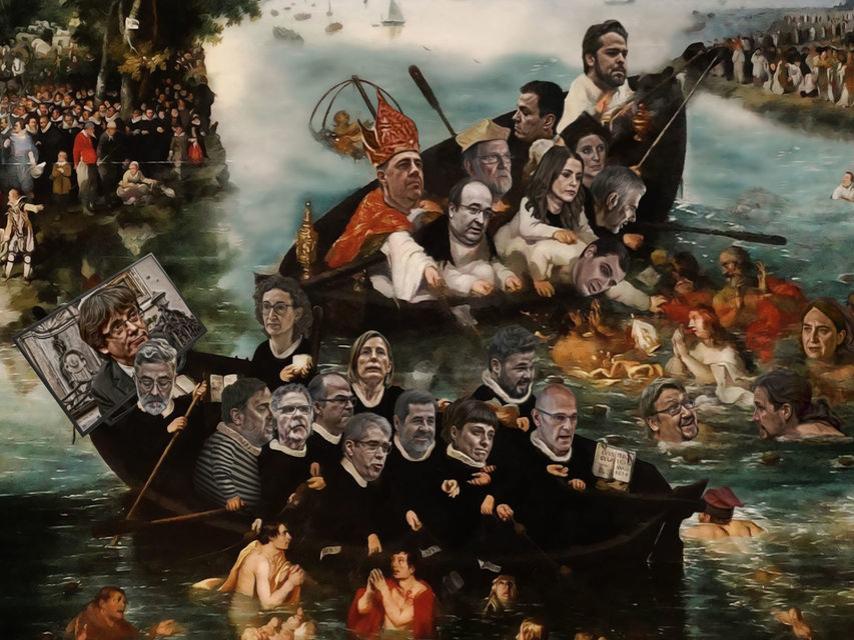 Basta echar un rápido vistazo al cuadro en cuestión para darse cuenta de que el tal Van de Venne pintaría muy bien, pero era de los de brocha gorda como Puigdemont. La alegoría se representa a través de dos orillas de un río, ocupadas por uno y otro bando, de las que parten barcas, provistas de redes para recoger a cuantos indecisos chapotean en el agua. En el lado protestante todos visten con compostura y austera dignidad, acorde con el mote de su padre fundador Guillermo el Taciturno; pero la hierba brilla en su verdor y los árboles florecen en un permanente augurio de fertilidad. Por el contrario la orilla católica parece una feria de vanidades, a base de cortesanos, cardenales y algún que otro bufón; pero la tierra está reseca y los troncos yertos carecen de follaje.