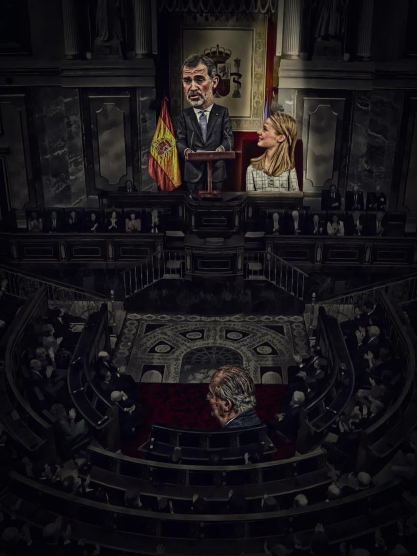 En cuanto a las tres personas reales que estuvieron entonces y vuelven ahora, nadando o al menos flotando en el mismo río constitucional, lo flagrante es que ha cambiado su posición en el dibujo: Juan Carlos ha dejado de ser Jefe de Estado, Sofía ha dejado de ser la Reina del disimulo y Felipe ha dejado de ser niño. Los tres fueron muy aplaudidos por toda la cámara, menos por uno de los grupos. Igual que en 1978.