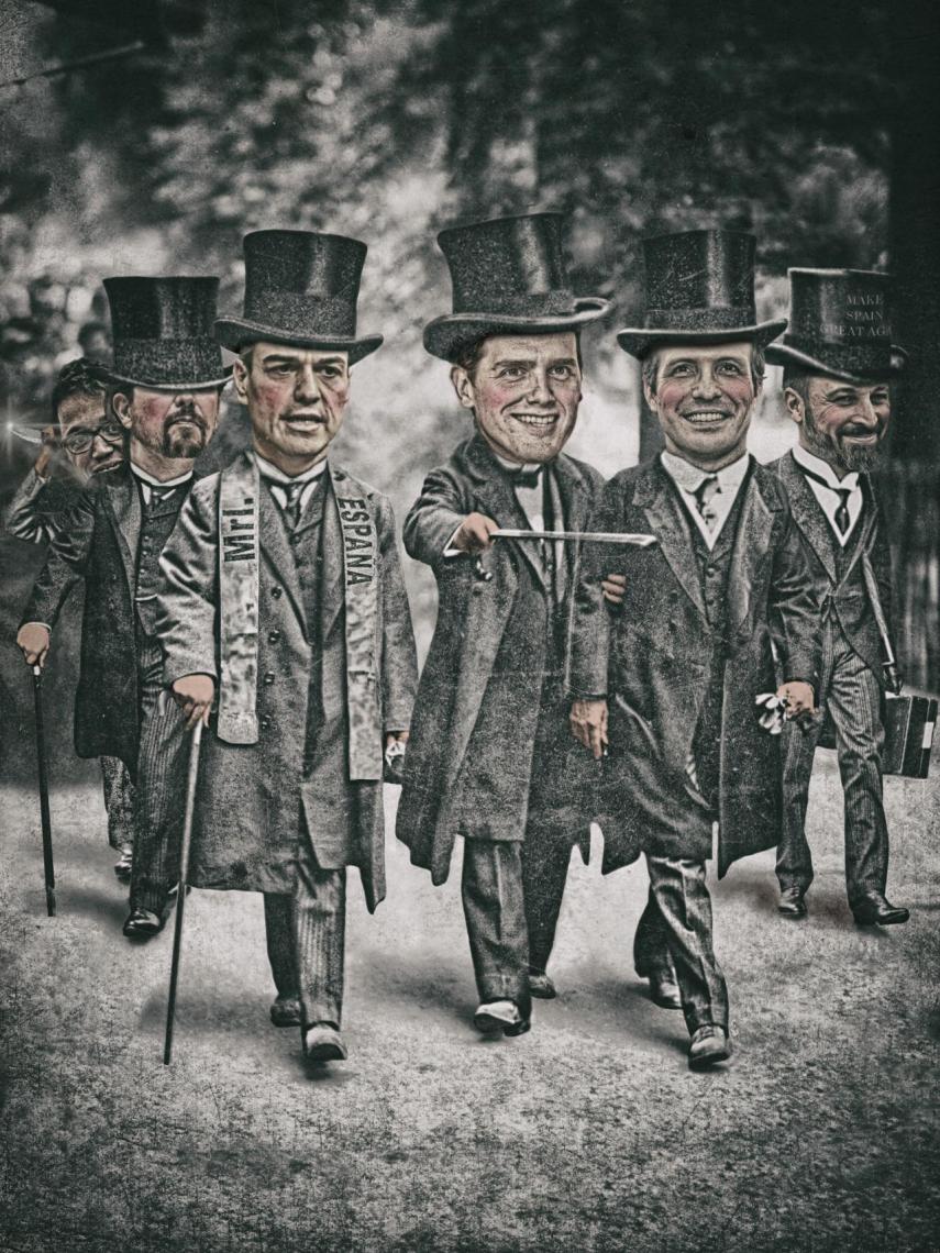 Fijémonos en la foto de hace cien años que ha inspirado hoy la ilustración de Javier Muñoz. Delante marchan el primer ministro británico Lloyd George, Clemenceau, bastón en ristre, y el presidente Woodrow Wilson. Detrás hay dos personajes con canotier, probablemente guardaespaldas, que muy bien podrían representar al séquito de actores secundarios. En ese tres más dos se ha convertido la política española actual.