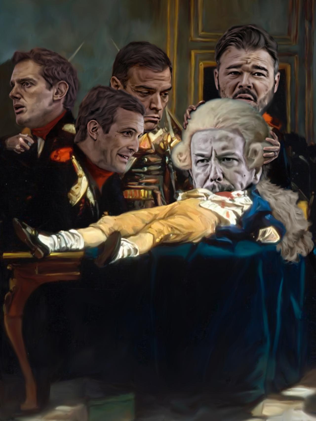 Algunos de los vencedores de la madrugada se agolpaban junto al improvisado lecho de su agonía, haciendo escarnio del infundio de que el "tirano" pretendía terminar ciñendo la corona. "¿Vuestra Majestad sufre?... ¡Mira que rey más guapo!", le espetaban entre risotadas. Robespierre sufría sin responder palabra, sujetándose el maxilar descoyuntado con la mano. Eran las mismas burlas y befas de los soldados romanos que ofrecían vinagre a Cristo en el Gólgota: “Si eres el Rey de los judíos, sálvate a ti mismo”.