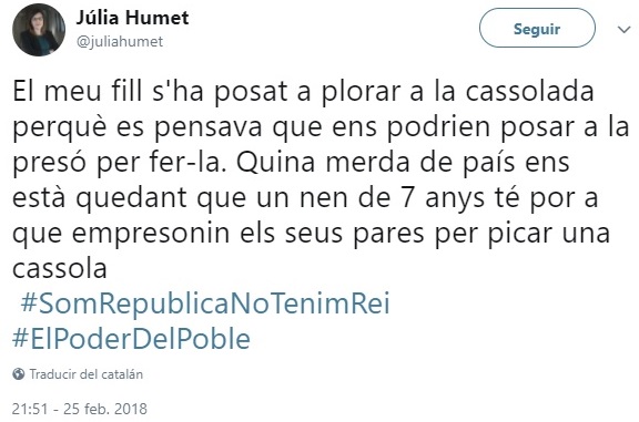Reírse de ellos es ya como reírse del tonto del pueblo. Acabo de hacerlo y me siento fatal (un poco). Las risas se me quitaron con el tuit de aquella madre independentista en la última cacerolada al Rey. El tuit, que fue en catalán –quizá el más escalofriante de todo el procés–, lo doy en la traducción de Cristian Campos: “Mi hijo se ha puesto a llorar durante la cacerolada porque se pensaba que nos podrían meter en la prisión por hacerla. Qué mierda de país nos está quedando cuando un niño de siete años tiene miedo de que encierren a sus padres por aporrear una cacerola”.