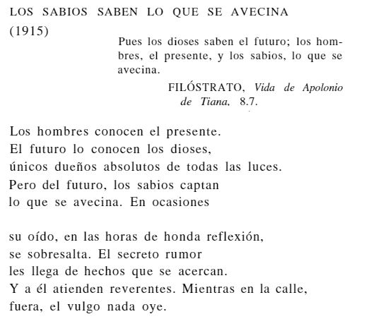 ‘Lo que se avecina’. Como en el poema de Cavafis (en la traducción de Bádenas de la Peña): “Los hombres conocen el presente. / El futuro lo conocen los dioses, / únicos dueños absolutos de todas las luces. / Pero del futuro, los sabios captan / lo que se avecina. En ocasiones // su oído, en las horas de honda reflexión, / se sobresalta. El secreto rumor / les llega de hechos que se acercan. / Y a él atienden reverentes. Mientras en la calle, / fuera, el vulgo nada oye”.