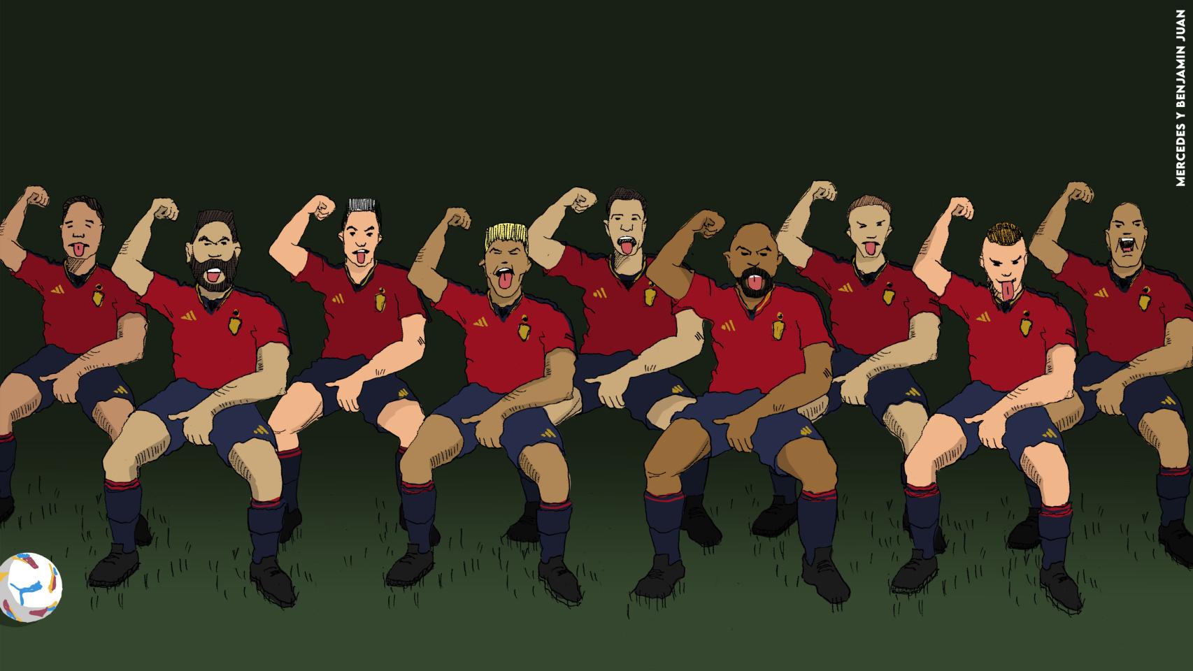 Después de muchos años de anodino “tiquitaca” y de un himno sin letra que se canta con la che, era de vital importancia realizar cambios que, según leemos en el dosier, enfatizaran la virilidad y la fiereza de los jugadores. Entre otras ideas, se proponía la adopción de una versión españolizada de la “Haka” de los temibles All Blacks. La letra incluiría expresiones como “manos en los huevos, doblen las rodillas, golpeen el suelo con los pies lo más fuerte que puedan”. Para añadirle una dosis extra de testosterona la llamarían la “HakaJones”.