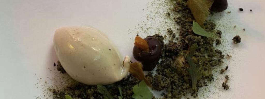 Bosque de setas. Hacemos un crumble con trompeta de los muertos que nos servirá de base de la tierra del bosque. Asar manzanas reinetas y triturar la pulpa reservando las pieles. Con rebozuelo cortado en cuatro, lo pasamos por el chocolate. Para emplatar, colocamos un poco de crema de manzana encima la tierra de trompetas, hojas de rúcula y rebozuelo por chocolate y las pieles de la manzana deshidratada y acabamos con un helado de nuez.