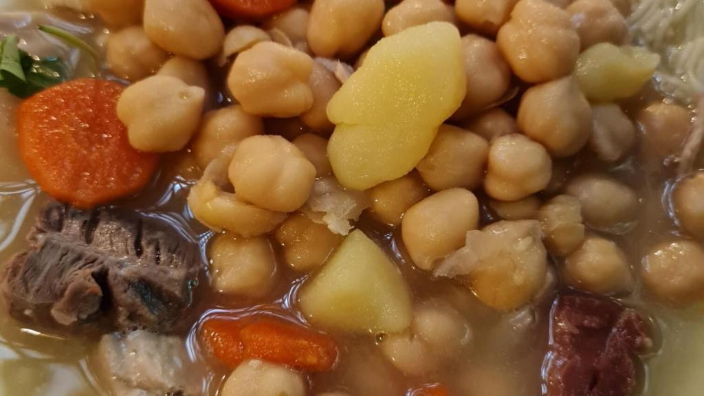 Puchero. En una olla grande con agua y sal se ponen a hervir garbanzos, en remojo desde el día anterior. Se retira la espuma y se echa la carne y los huesos hasta que se cueza todo bien. Añadimos las verduras, primero el nabo, el apio y el puerro; más tarde, las zanahorias en rodajas y las patatas en trocitos y los fideos. Se saca el nabo, el apio y el puerro, que no se ponen en el plato final, y se sirve el puchero con caldo, garbanzos, fideos, verduras y algunos trozos de carne. El resto, con el tocino, se coloca aparte para la pringá con pan.