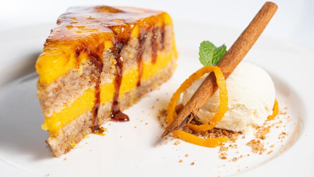 Tarta sabor Altea. Es un bizcocho de toda la vida que hacía la abuela de Joan. Lleva la piel, la pulpa y el zumo de la naranja y se elabora con huevo, harina y almendra. Después se abre el bizcocho por arriba y se rellena de zumo de naranja y crema de la pulpa. Se vuelve a tapar y la parte superior se rellena con pulpa de la naranja y se quema como en la crema catalana. Va acompañada de helado de vainilla.