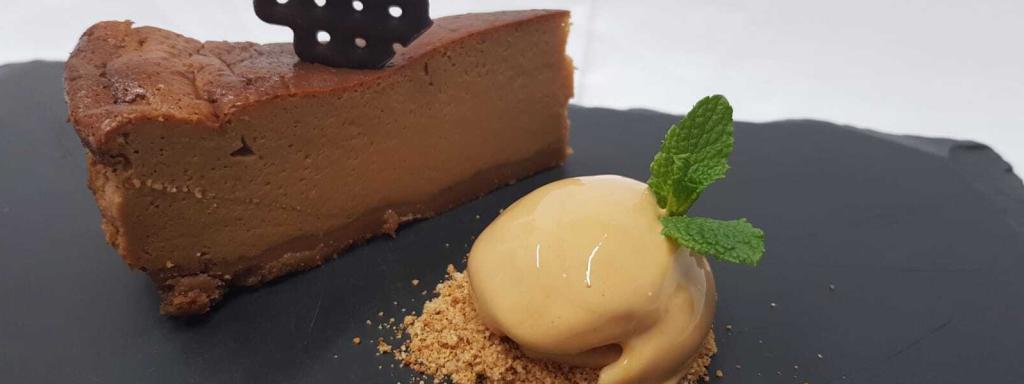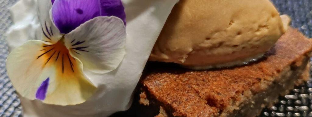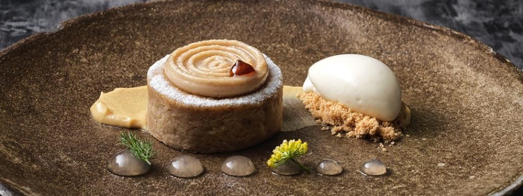 Tarta de castañas y helado de fiuncho (hinojo). La tarta de castañas la hacemos partiendo de un puré de castañas cocidas, mantequilla, azúcar, vainilla y harina, cocinada al horno. La acompañamos de un helado de hinojo, en Galicia siempre se cocieron las castañas con esta hierba, y hacemos un zumo de limón con almíbar. Lo espesamos para acompañar la tarta porque los cítricos casan bien con las castañas y el hinojo. La parte más golosa la hacemos con chocolate Dulcey de Valrhona.