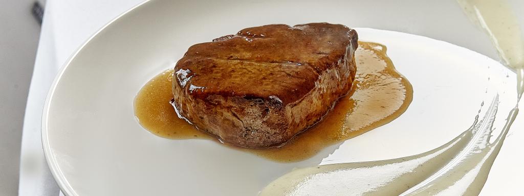 Solomillo con muselina de patata. Usamos carne de la Sierra de Guadarrama. La troceamos en medallones que marcamos por la parte exterior a temperatura muy alta para que las proteínas y azúcares de la carne caramelicen bien (efecto mayard). Lo dejamos reposar un poco y los acabamos en el horno a 200º durante 4 minutos. Con el jugo que ha quedado en la sartén tras cocinar la carne, hacemos una "salsa de sartén" con un poco de mantequilla y unas cebollitas picadas finas, un chorrito de vino blanco y dejamos que reduzca casi a seco. Luego añadimos un poco de caldo y terminamos con un chorrito de soja. Se sirve con una muselina de patata (patatas cocidas, mantequilla y leche, que se bate para que quede una textura de lágrima).