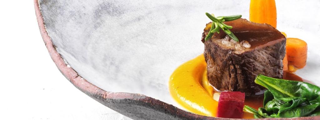 Solomillo de vaca, calabaza, zanahorias, espinacas tiernas y salsa de Oporto y PX. Cortamos el solomillo en raciones y lo hacemos a la plancha en el punto deseado. La salsa la hacemos reduciendo el Oporto y el PX a partes iguales en un cazo, sazonamos con sal y pimienta negra recién molida. Para el puré de calabaza, las asamos troceadas en el horno con un poco de sal y aceite hasta que estén tiernas y trituramos la pulpa con AOVE, sal y un poquito de zumo de naranja. Salteamos las espinacas frescas a fuego rápido y escaldamos las zanahorias en agua hirviendo para hacerlas luego a la plancha.