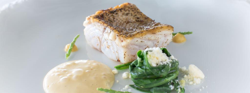 Cherne con gazpachuelo de vinagre macho. Cocinamos al vapor la espinaca y la escurrimos en papel. Marcamos el lomo de cherne por la piel y terminamos su cocción con un golpe en el horno. Para hacer el gazpachuelo de vinagre, clarificamos la mantequilla y en un vaso mezclador ponemos la yema y añadimos el caldo y trituramos. Le vamos añadiendo mantequilla poco a poco procesando para que la mezcla sea homogénea y por último, ponemos vinagre, pimienta y sal. Para completar podemos añadir una crema de limón que se hace poniendo pasta de limón, el zumo y la mezcla de especias ras el hanout al fuego a reducir, y en un caldero a parte blanqueamos las pieles de limón tres veces partiendo de agua fría. Cuando el zumo esté reducido, lo colocamos junto a las pieles blanqueadas y el resto de ingredientes en un robot de cocina y procesamos. Tamizamos la crema y la pasamos a una manga.