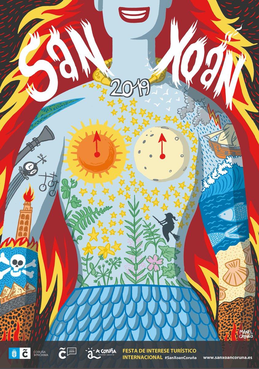 El diseño es obra del artista coruñés Manel Cráneo. En este cartel recrea con vivos colores a una sirena, cuyo pelo es el fuego de las hogueras, que cada año iluminan las playas coruñesas. Los brazos de este ser están tatuados con lugares emblemáticos de la ciudad, como la Torre de Hércules o el Obelisco. También hay muchos motivos marineros y los pechos son los ciclos del día y la noche, en referencia al solsticio de verano.