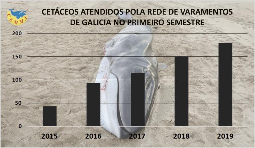 El total de cetáceos atendidos el primer semestre llegó a 180, el más alto de los últimos años. "Los varamientos se producen con mayor probabilidad en las entradas de las rías, especialmente las que están afectadas por vientos y corrientes del oeste. Pongamos como ejemplo la Lanzada o Corrubedo"