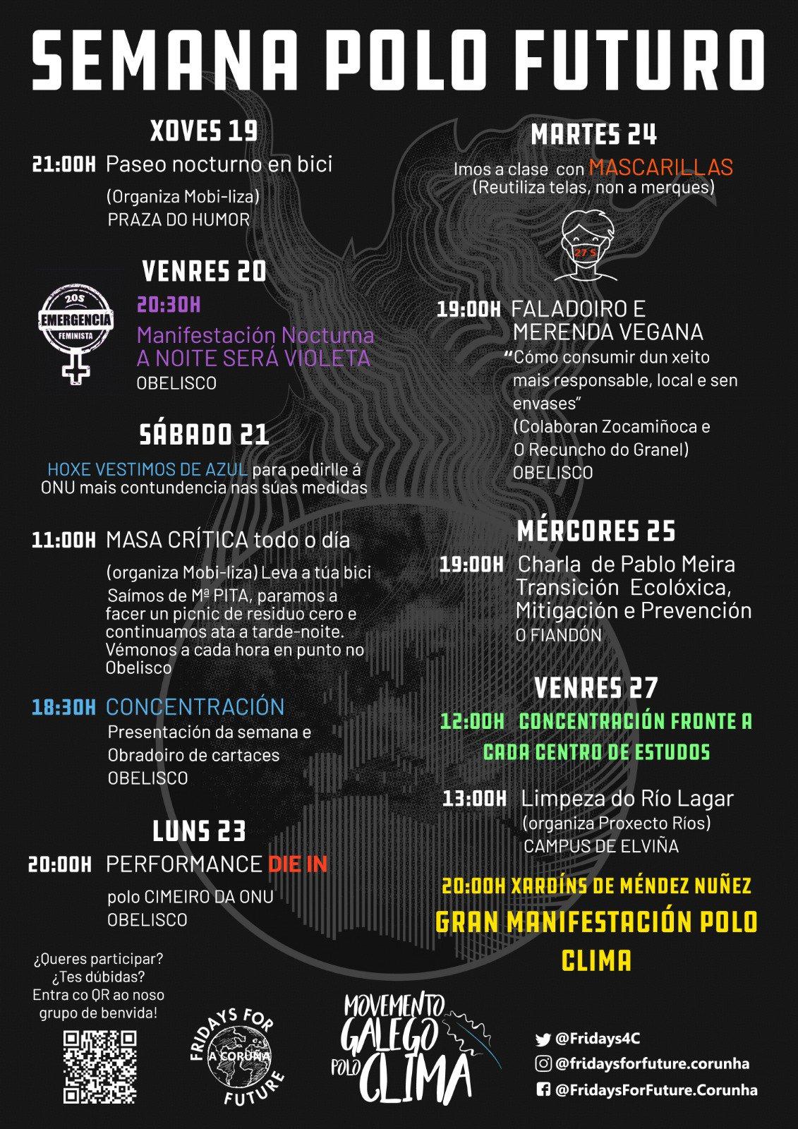 Por ejemplo, hoy miércoles, Pablo Meira hablará de transición ecológica en O Fiandón, y para el próximo viernes, día de la huelga mundial por el clima, se ha convocado una limpieza simultánea de ríos en Galicia.