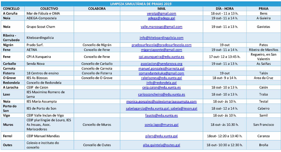 De las cerca de 50 entidades participantes, 31 serán centros de enseñanza de secundaria, institutos y la Oficina de Medio Ambiente de la Universidade da Coruña, que realizarán su actividad el viernes, 18 de octubre en horario de mañana. Tan solo en Muros, participarán 18 cientos educativos. El sábado, 19 de octubre, también participarán en el VIII Limpieza Simultánea de playas convocada por Adega unas 10 entidades de carácter ecologista, de deporte o aire, o ligadas a la producción marisquera.