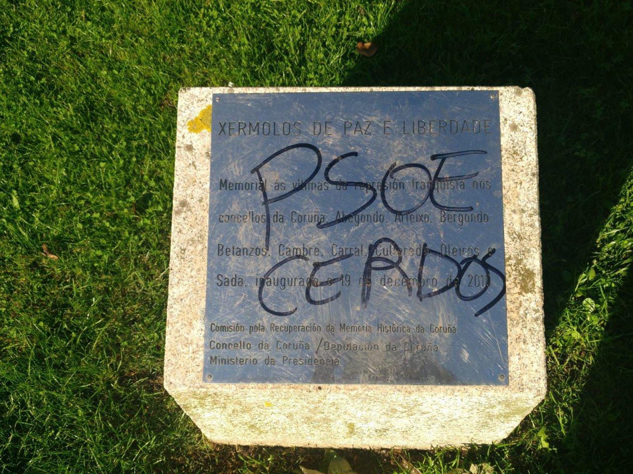 No es demasiado habitual que se profanen símbolos por ideas políticas en A Coruña. Sin embargo, ayer el monumento a las personas fusiladas en la provincia durante la sublevación fascista de 1936 apareció con pintadas. En una se podía leer "Franco" y en otra "PSOE cerdos".