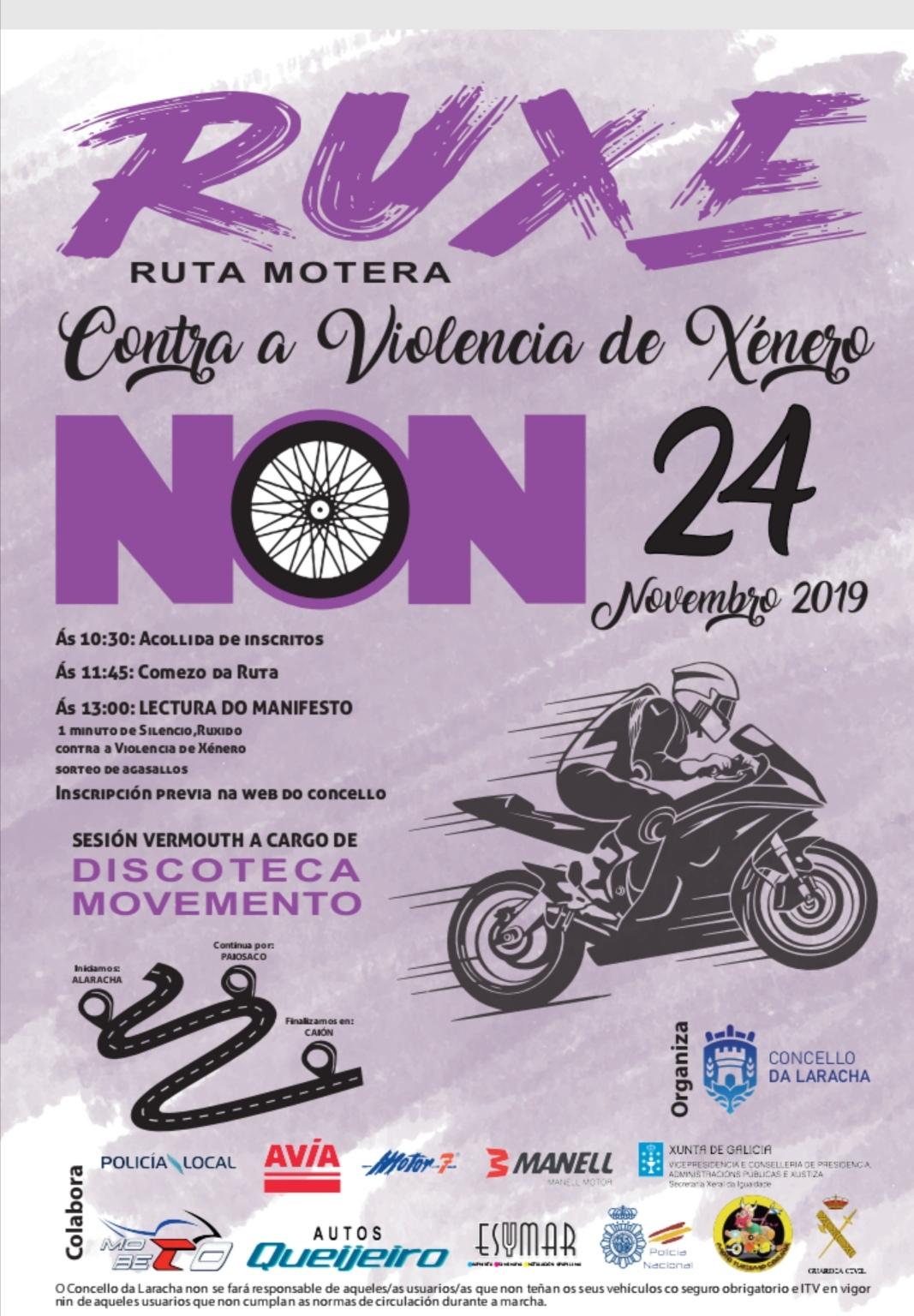 Por otro lado, el 24 de noviembre, jornada previa a este Día Mundial, las motos rugirán contra la violencia de género en A Laracha, en una ruta que terminará en Caión con un minuto de silencio. La Guardia Civil, la Policía Local y la Nacional se sumarán a esta ruta motera que organiza el concello de A Laracha, en cuya web es posible inscribirse.