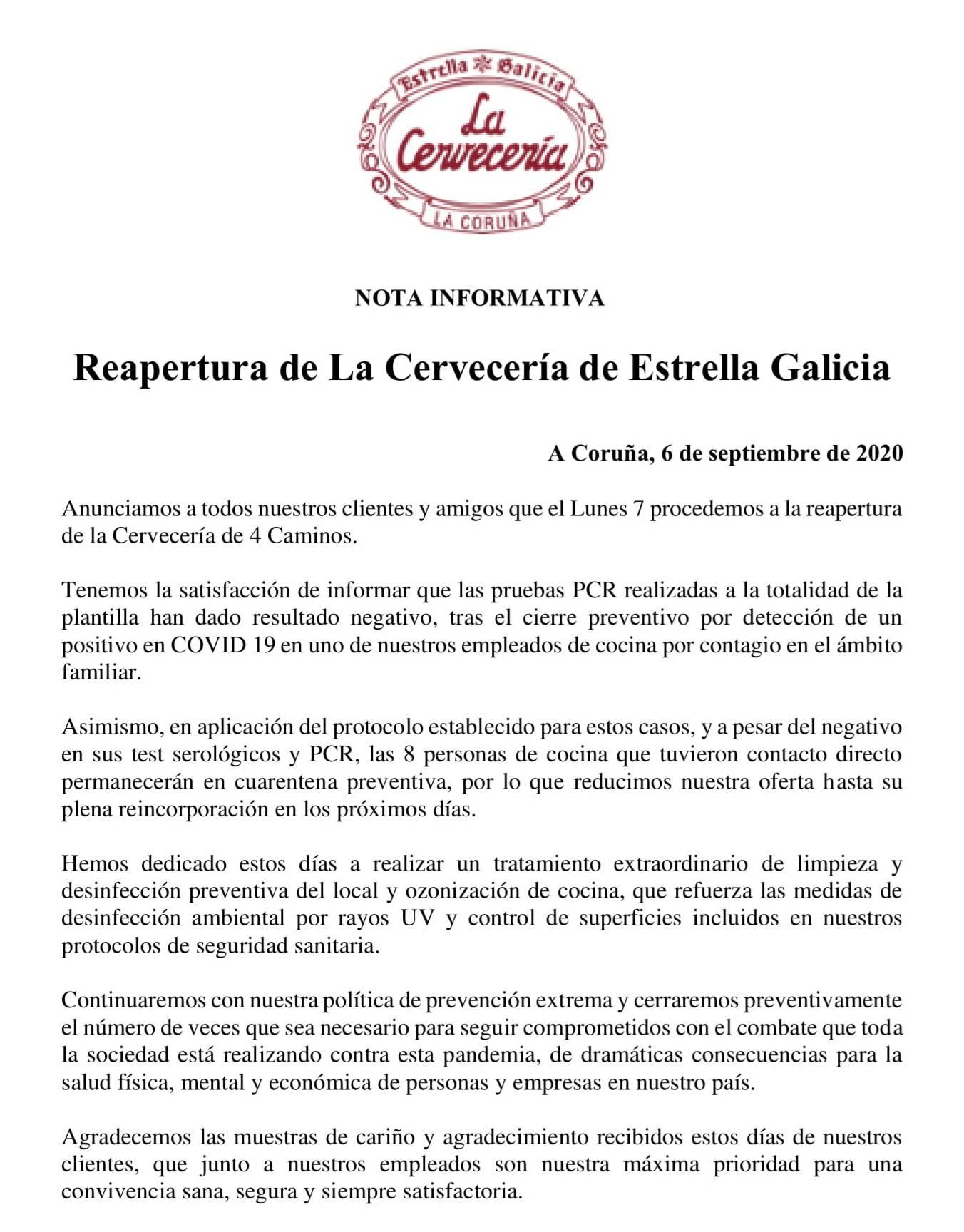 La Cervecería de Estrella Galicia abrirá sus puertas de nuevo mañana tras unos días cerrada después de que uno de sus empleados diese positivo en coronavirus y la empresa decidiese cerrar preventivamente. Así lo han anunciado a través de un comunicado, en el que han agradecido también el cariño recibido.
