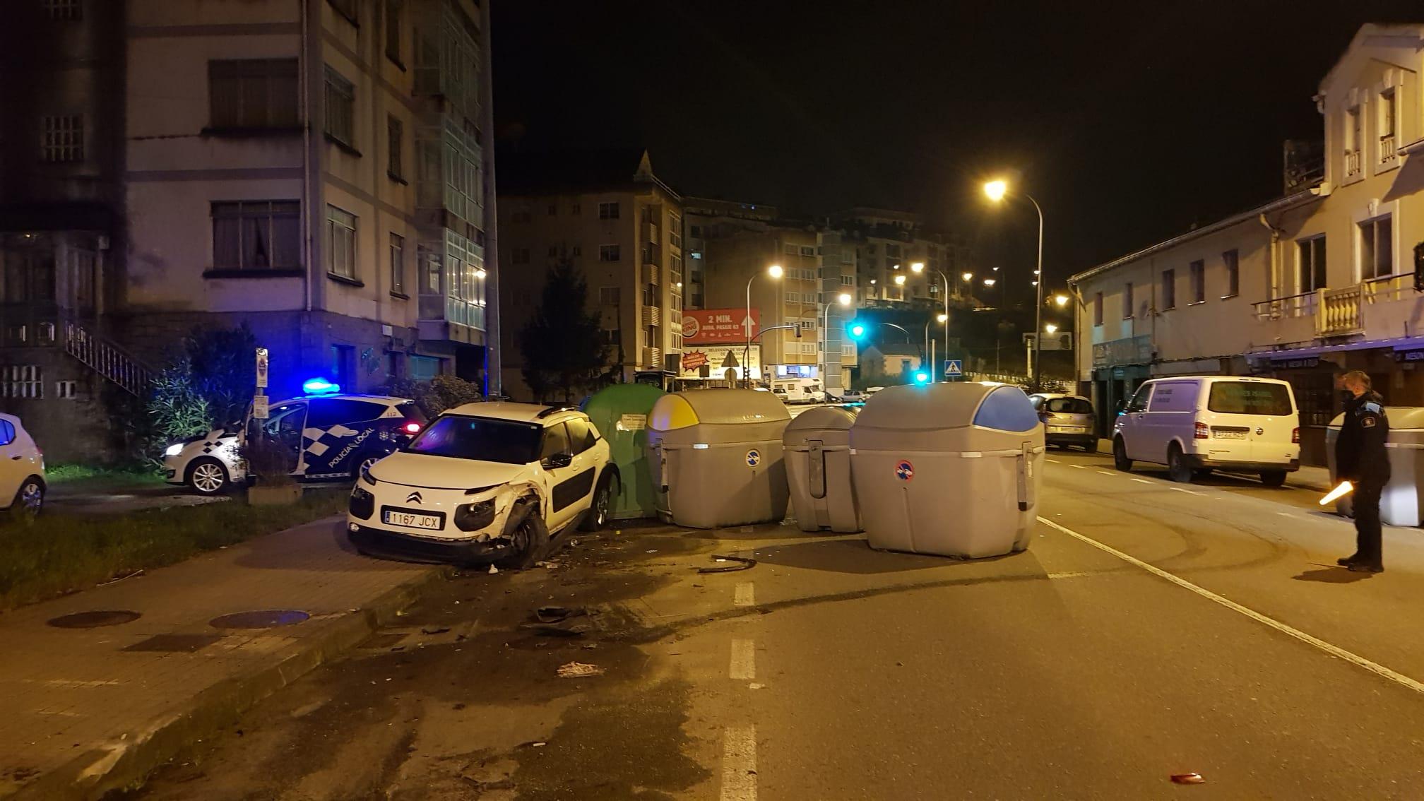 Al llegar los agentes comprobaron que un vehículo estacionado presentaba un fuerte impacto en la parte delantera izquierda, con daños en el lateral, las ruedas y también la parte trasera, al haberse incrustado contra la farola del alumbrado público. Además, tres contenedores habían sido desplazados por el impacto al medio del carril. Tras analizar la zona, se concluyó que un turismo desconocido, que circularía en dirección hacia A Pasaxe, tuvo una salida de la vía, colisionando contra el coche aparcado y los contenedores, dándose a la fuga.