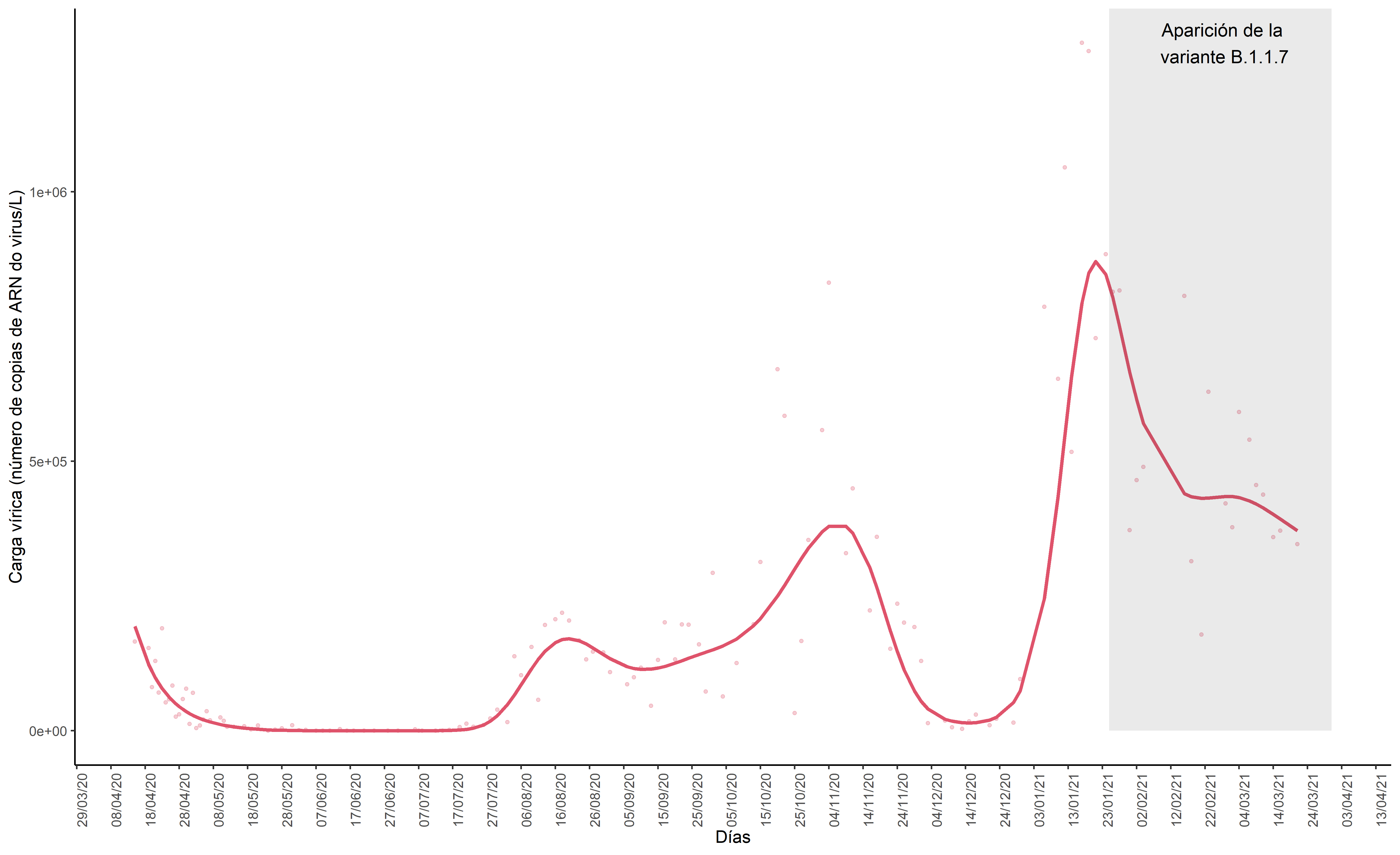 La nueva estimación detecta un descenso en la concentración de coronavirus en las aguas residuales de A Coruña ciudad y sus municipios cercanos desde la segunda semana de marzo. Este descenso es más lento que el experimentado desde finales de enero, con las medidas más restrictivas en marcha, pero está aparentemente condicionado por la presencia dominante de la cepa británica, cuya permanencia en aguas residuales es aparentemente muy superior al de la cepa original del virus. Esto hace que la carga vírica sea mayor, pero tenga menor correspondencia en casos activos, según se deduce del estudio de CovidBens.