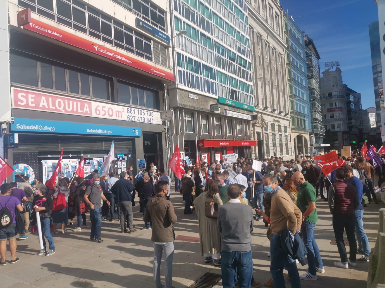 Decenas de trabajadores se manifestaron por el centro de A Coruña para intentar evitar el cierre de 41 oficinas y el despido del 20% de la plantilla en la comunidad
