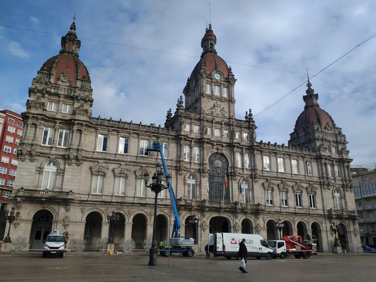 La Navidad va tomando forma en A Coruña con la instalación de las luces navideñas que el próximo 4 de diciembre se iluminarán tras un acto que se celebrará en María Pita. Y precisamente en esta plaza están trabajando varios operarios para colocar las luminarias que cada año cuelgan de la fachada del Palacio Municipal.