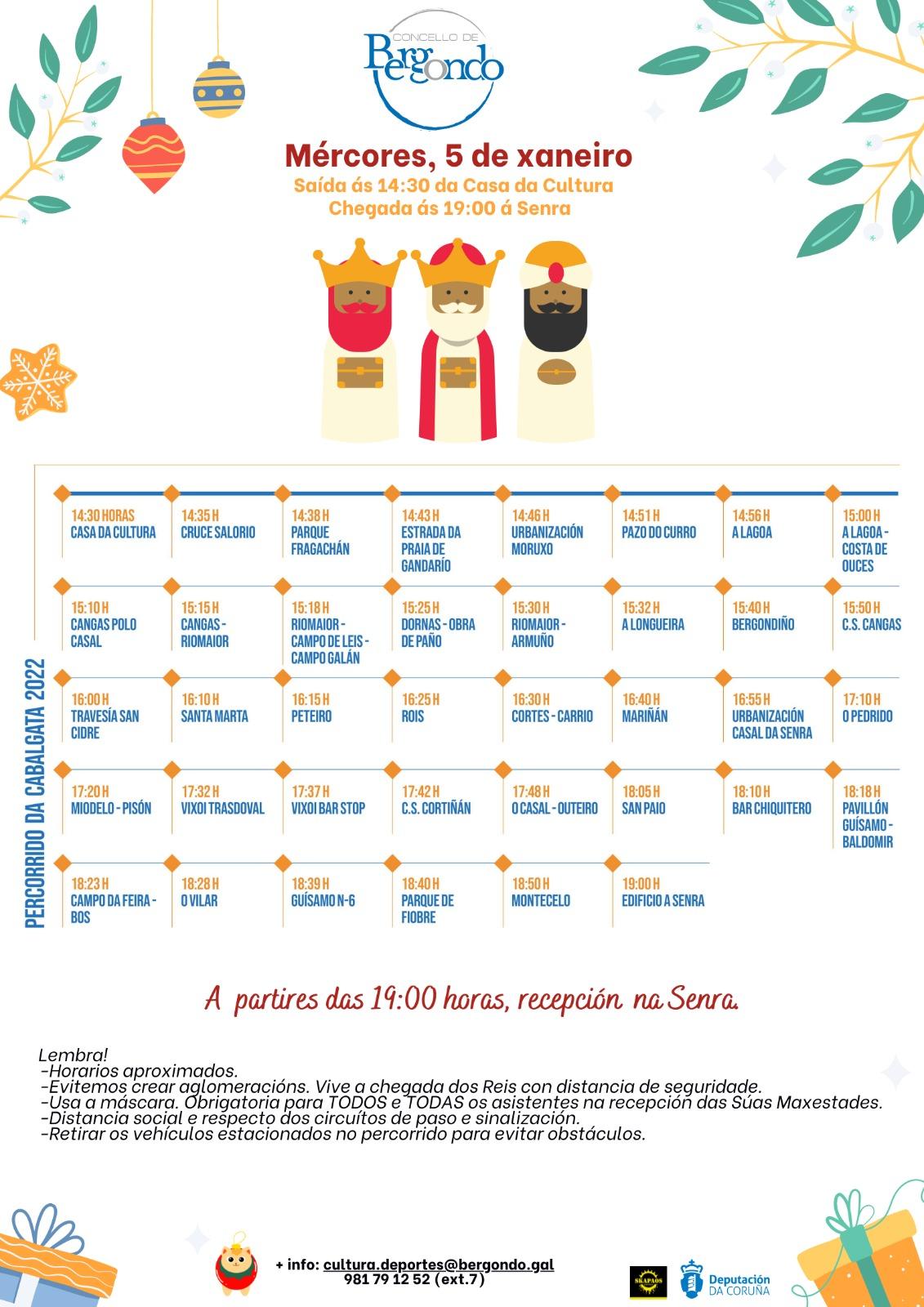 Bergondo es uno de los municipios del área coruñesa que han decidido apostar porque los Reyes Magos recorran las calles. Oleiros ya hizo públicos los horarios y el recorrido de la Cabalgata la semana pasada y A Coruña ha confirmado que Sus Majestades de Oriente irán desde el mercado de Sardiñeira hasta la plaza de María Pita. Otros ayuntamientos como Culleredo, Cambre y Arteixo, sin embargo, organizarán una recepción.