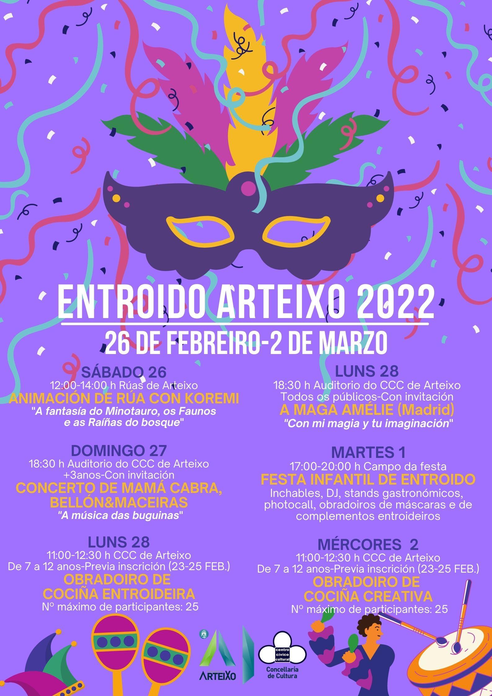 El domingo 27, en el Auditorio de Arteixo, habrá concierto de Mamá Cabra con su nueva producción "A música das buguinas", un concierto didáctico dramatizado, acompañados por Daniel Bellón e Diego Maceiras, músicos de reconocido prestigio en Galicia y con trayectoria consolidada en solitario, aunque en la actualidad forman el grupo Bellón&Maceiras. El lunes 28 de febrero y el miércoles 2 de marzo, se celebrarán dos obradoiros de cocina de Carnaval y creativa en el Centro Cívico Cultural de Arteixo dirigidos a niños de entre 7 y 12 años con un límite máximo de 25 plazas.