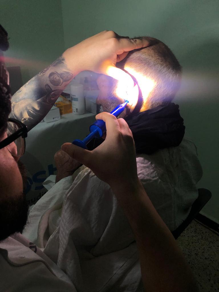"Este paciente acudió a nosotros después de recibir un disparo en la cara. En el hospital le hicieron la extracción de los restos de la metralla del rosto y, después, esperó en la sala de espera a que lo atendiésemos porque llevaba más de cuatro años esperando poder oír", explica Belisario. El oído izquierdo era completamente disfuncional y el oído derecho tenía una pérdida muy grave debido a la exposición a los ruidos de la guerra. Los impulsores del proyecto y los trabajadores del hospital, sin embargo, lograron hacer una adaptación satisfactoria en el oído derecho. "Estaba deseando poder contárselo a su familia", indica el coruñés
