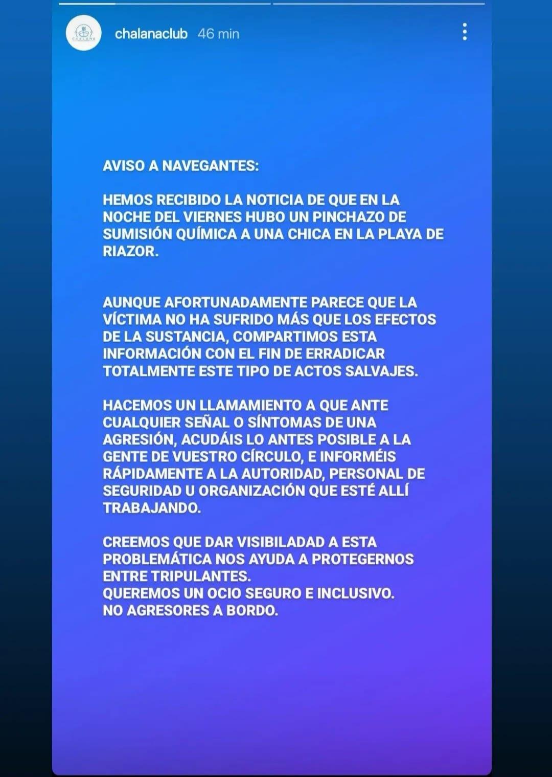 Uno de los casos más recientes y acerca del cual los responsables del local se han pronunciado en redes sociales, ha sido el que supuestamente ha tenido lugar en el Chalana Club de A Coruña en la playa de Riazor. En un comunicado, se informa de que en la noche del viernes una chica sufrió un pinchazo.