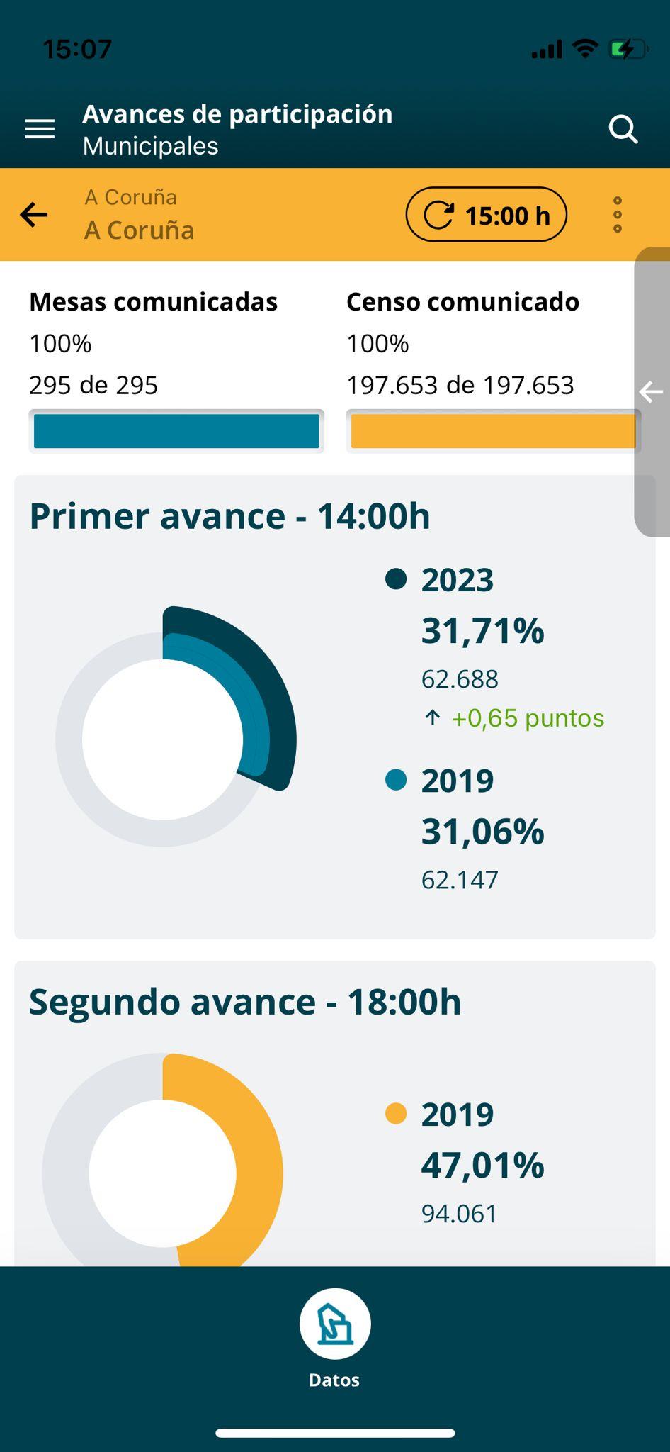 Unos 924.407 electores coruñeses podrán elegir a sus alcaldes este domingo, lo que supone casi 6.350 menos que hace cuatro años y la participación en A Coruña ciudad es hasta ahora del 31,71% (un 0,65% más que hace cuatro años a esta hora), según datos oficiales del Ministerio del Interior y, por provincias, la participación a las 14:00 horas ha alcanzado el 34,01% en A Coruña (+1,11%); el 38,02% en Lugo (+3,85%); el 39,58% en Ourense (+2,04%); y el 35,31% en Pontevedra (+0,67%).