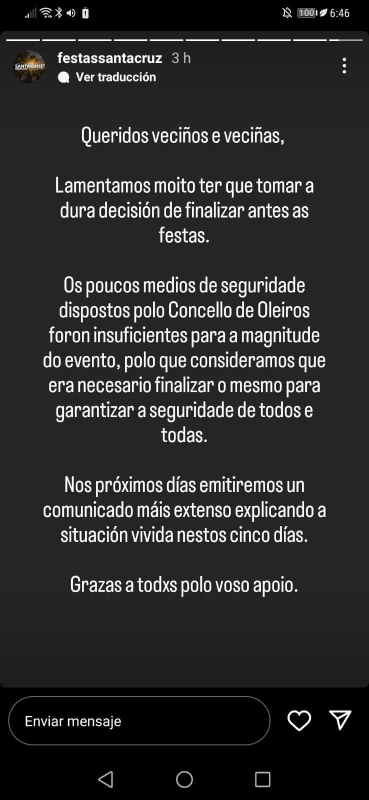 A todo esto se une el malestar de los organizadores de las fiestas de Santa Cruz, que desde sus redes sociales han denunciado esta noche que han tenido que adelantar el final de las celebraciones programadas a causa de "los pocos medios de seguridad dispuestos por el Concello de Oleiros", que además denuncian que "fueron insuficientes para la magnitud del evento".