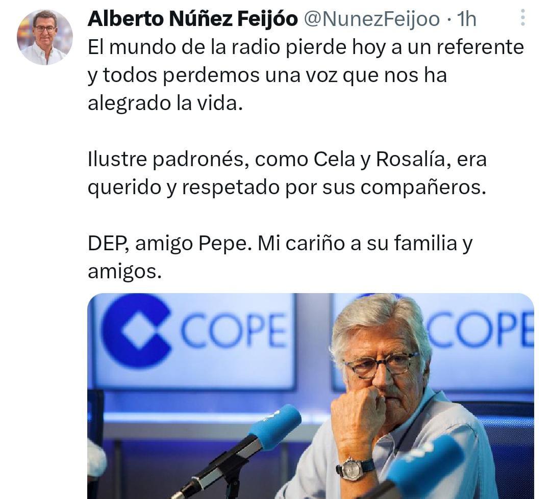 "Ilustre padronés, como Cela y Rosalía, era querido y respetado por sus compañeros", decía el líder del Partido Popular, Alberto Núñez Feijóo, que recordaba su amistad con el locutor. Unas palabras en las que coincidía el presidente de la Xunta, Alfonso Rueda, que resaltaba el cariño de Pepe Domingo hacia Galicia. Los socialistas gallegos también recordaban al locutor, con palabras de cariño de Gonzalo Caballero y de José Ramón Gómez Besteiro. El Concello de A Coruña también lo ha recordado.
