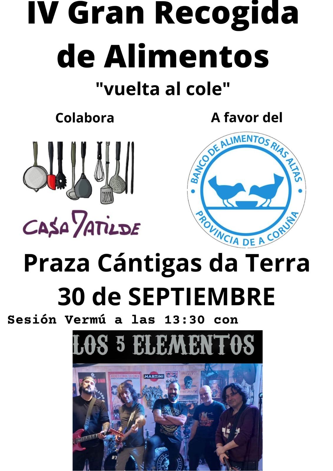 La recogida, en la que colabora Casa Matilde, tendrá lugar en la plaza Cántigas da Terra y estará amenizada por 5 Elementos, grupo de versiones rock. El evento dará comienzo a las 13:30 horas aproximadamente.