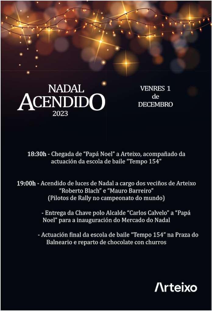 El encendido de las luces de Navidad se producirá a las 19:00 horas y serán dos vecinos de Arteixo los encargados de darle la bienvenida a esta época señalada. Los pilotos de rally en el campeonato mundial Roberto Blach y Mauro Barreiro encenderán el alumbrado navideño.