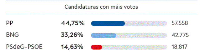En cuanto a la lectura de los datos, cabe destacar respecto a las anteriores elecciones de 2020, una ligera bajada de apoyo al PP en A Coruña de casi un punto y medio, el crecimiento del apoyo al BNG, que subió más de 8 puntos en la ciudad y es llamativa la bajada de tres puntos en el porcentaje de voto al PSdeG en una ciudad con una alcaldesa socialista.
