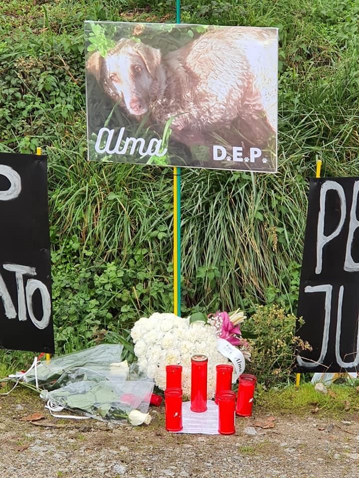 Hace unos días que Alma moría al no poder superar las graves heridas que le infringió su dueño, un cazador de Chantada (Lugo). El hombre arrastró al animal y le disparó dos veces. Ahora, en ese lugar donde han colocado un improvisado altar.